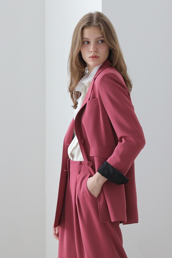 • 브릭 레드 컬러의 루즈핏 셋업 테일러드 재킷 어깨 패드가 내장되어 있어 어깨와 아웃 핏을 깔끔하게 잡아 줌 언밸런스한 포켓 포인트 함께 코디된 핀턱 와이드 팬츠와 셋업으로 추천